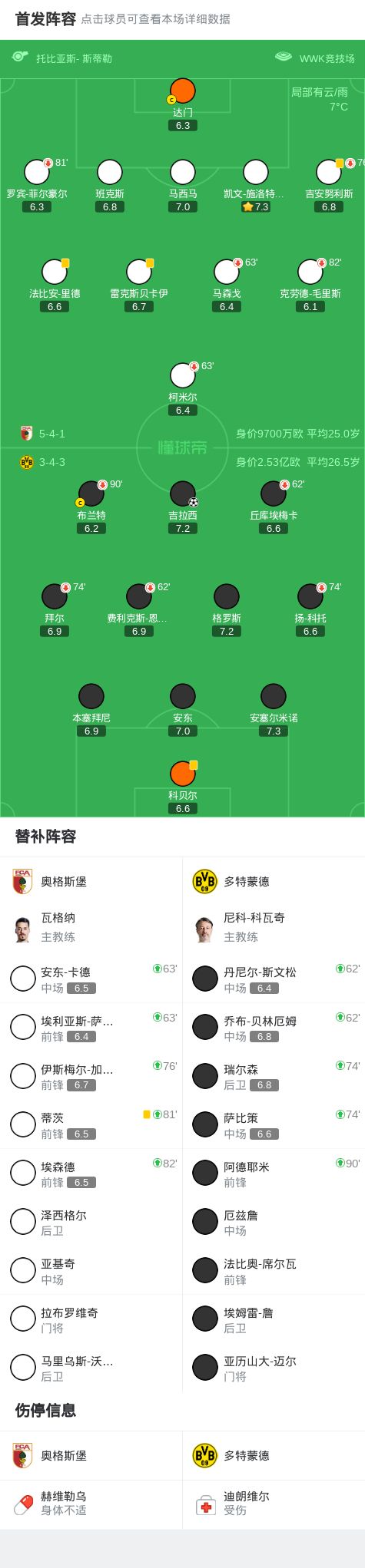第71分钟,奥格斯堡获得良机,乔林-贝林厄姆做出关键封堵